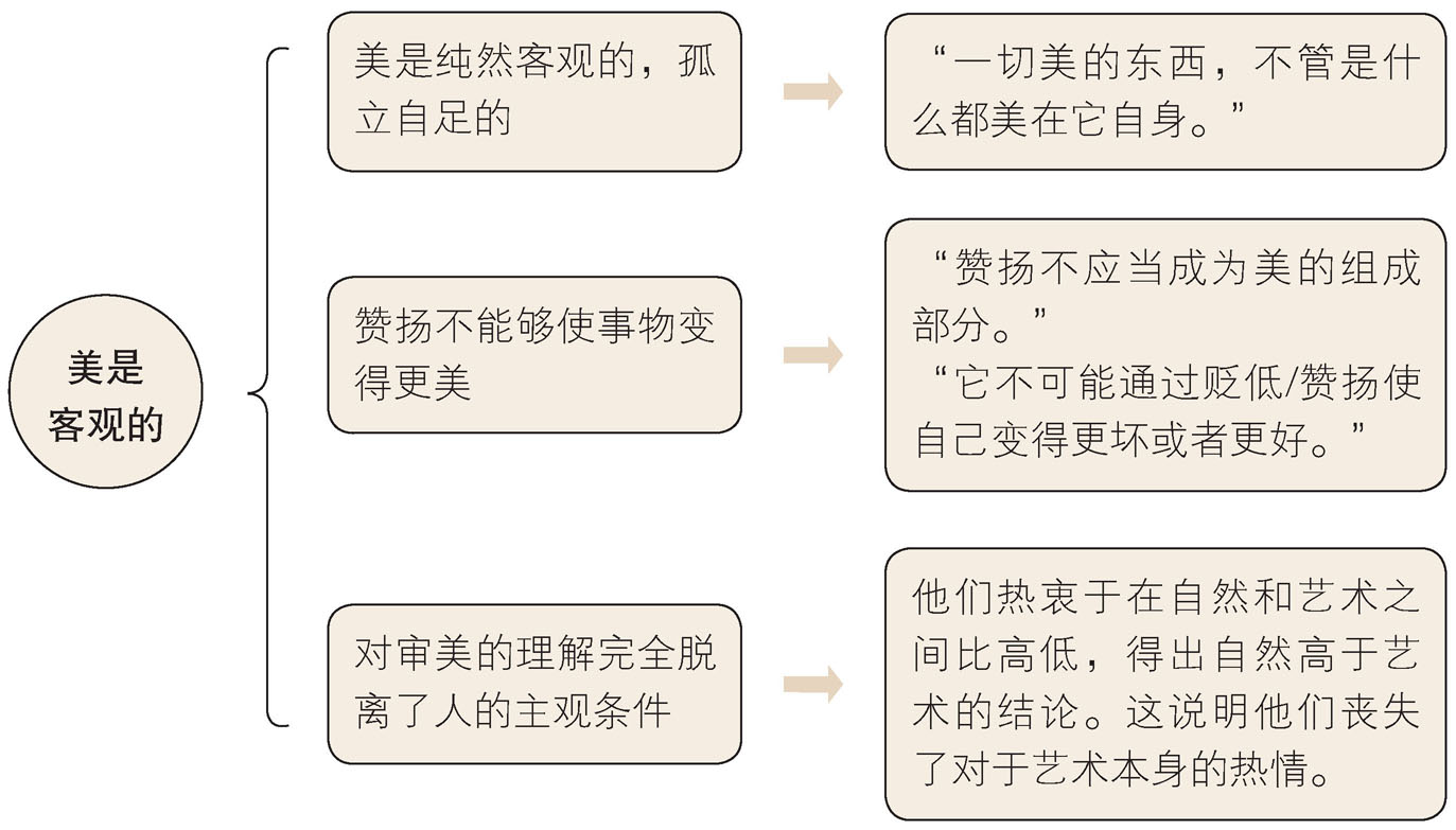 但是这样的思想也有一定的局限性。他们认为人的理性是重要的,所以就完全忽略了感性思维和情感因素的重要性。他们对于审美的理解是完全客观的、理性的,脱离了人是审美主体的条件。所以他们主张人类的赞扬并不是事物美的原因,事物不可能因为人的赞扬就会变得更美,也不会因为人类的贬低就变得更丑。同时,这样的思想使他们非常热衷于在自然和艺术之间作比较,而且总是得出自然高于艺术的结论。这就说明他们对于审美活动和艺术本身并没有充分的热情。