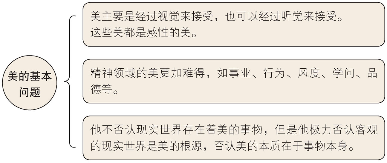 他还对美感的问题进行了一些研究,他认为人在感官上获得的享受和快乐也是一种美,比如说味觉的美。他曾经说,人们认为食物和香味就是美的,因为他们在享用佳肴的那个时刻就是美的。后来他的这个观点经常被后人引用。