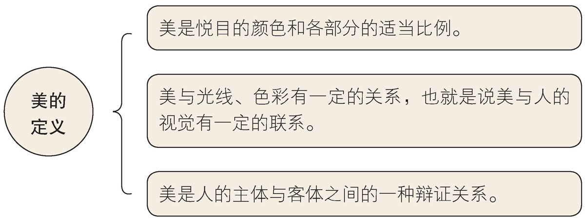 西塞罗对于美的定义是:美是悦目的颜色和各部分的适当比例。定义的前半部分是亚里士多德早已提出的美学定义,指的是事物本身具有的客观因素。西塞罗在后面又加上了自己的理解,不仅仅是看到了色彩的关键作用,更重要的是将人的感觉和体验放在了一个重要的位置。也就是说,他认为 美产生于主观观念和客观物质的辩证统一 。