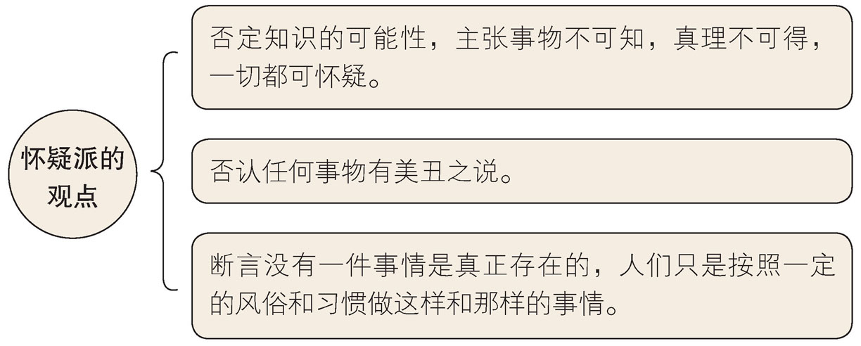 在各种美学观点都开始出现的时候,也就同时出现了与他们的观点相反的声音。这种反对的声音就来自于怀疑派。他们认为某种理论是错误的,或者没有意义的,更甚者会认为某些事情是完全不存在的。他们的这种美学观念虽然有明显的唯心主义和诡辩主义的错误,但是在一定程度上又为美学的发展增加了一些不同角度的思考。