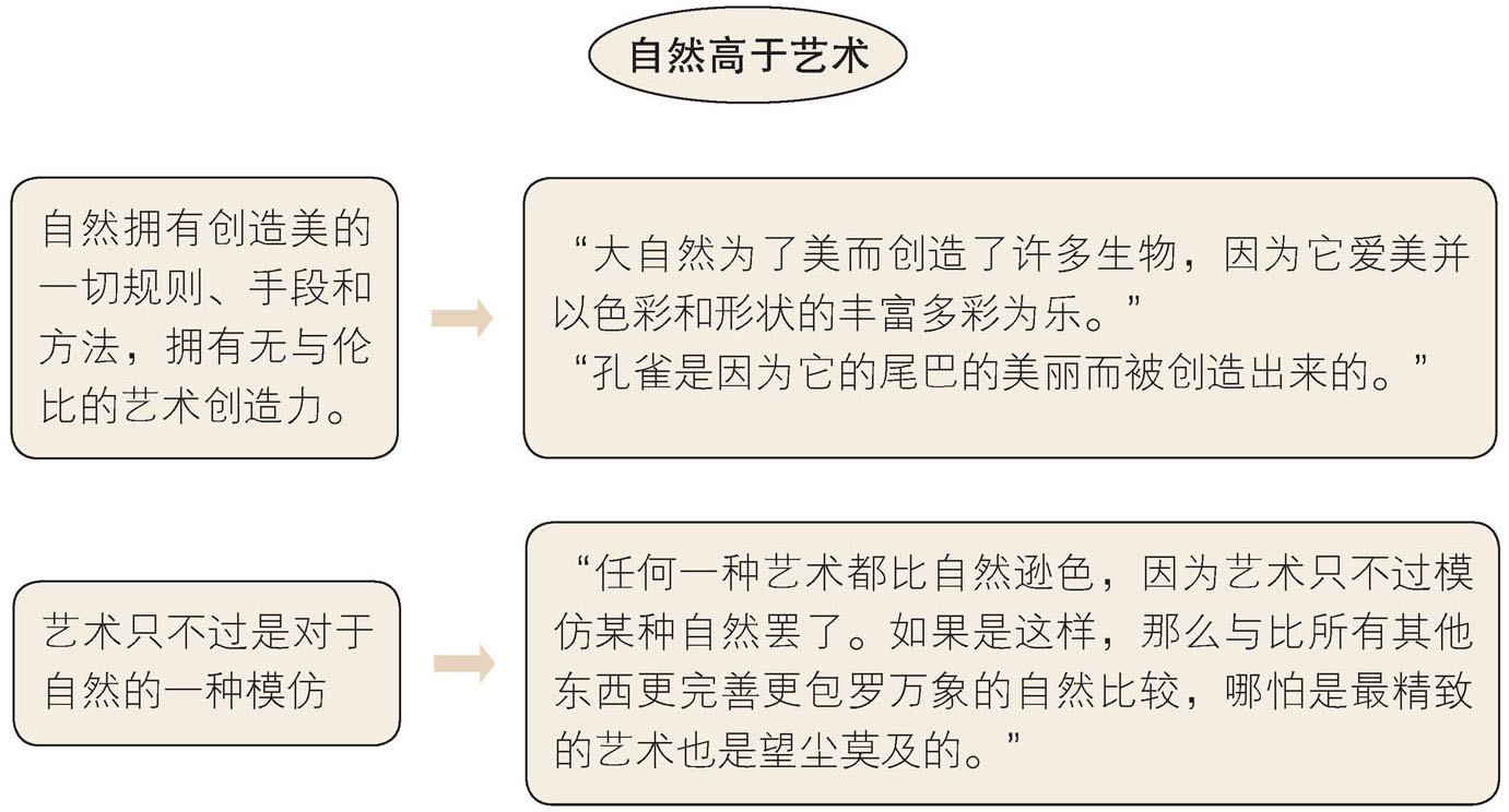 他们在自己的学说中极力肯定了自然本身的创造力,得出了自然高于艺术的结论。实际上他们将美的概念 过于客观化 ,脱离了人的主观认识,这一点是有缺陷的。