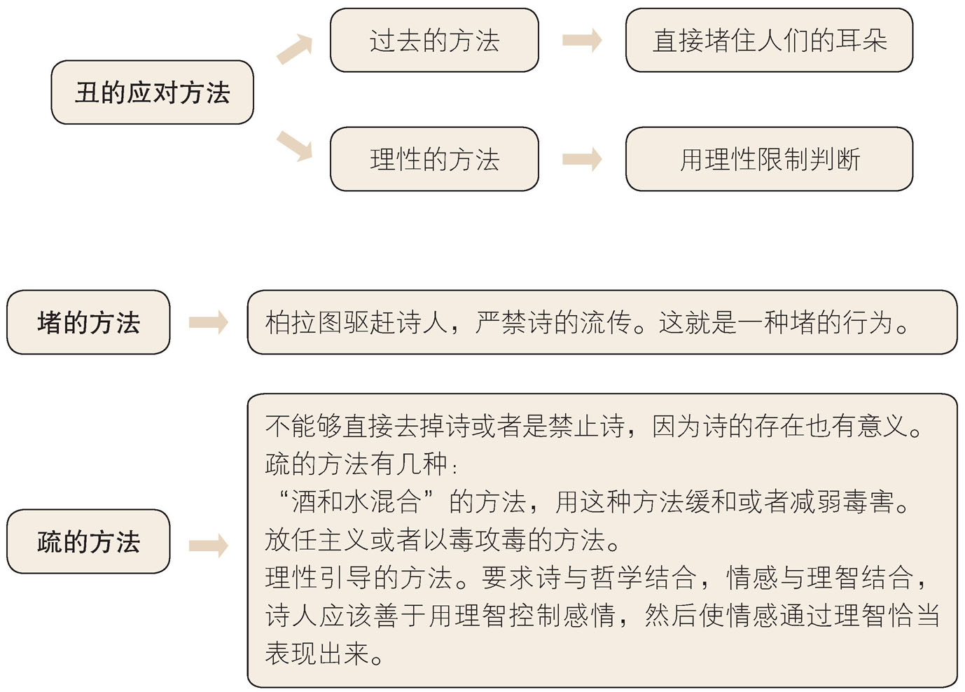 在对丑论述完之后,普鲁塔克又开始研究如何应对丑。在诗的问题中,他认为不应该直接堵住青年人的耳朵,不让他们再看这类的诗歌,而是应该 “用理性限制他们的判断” ,将道德的判断事先教给他们,让他们具有判断好坏的能力,这样就能够避免诗歌中的不道德现象对他们造成负面的影响。