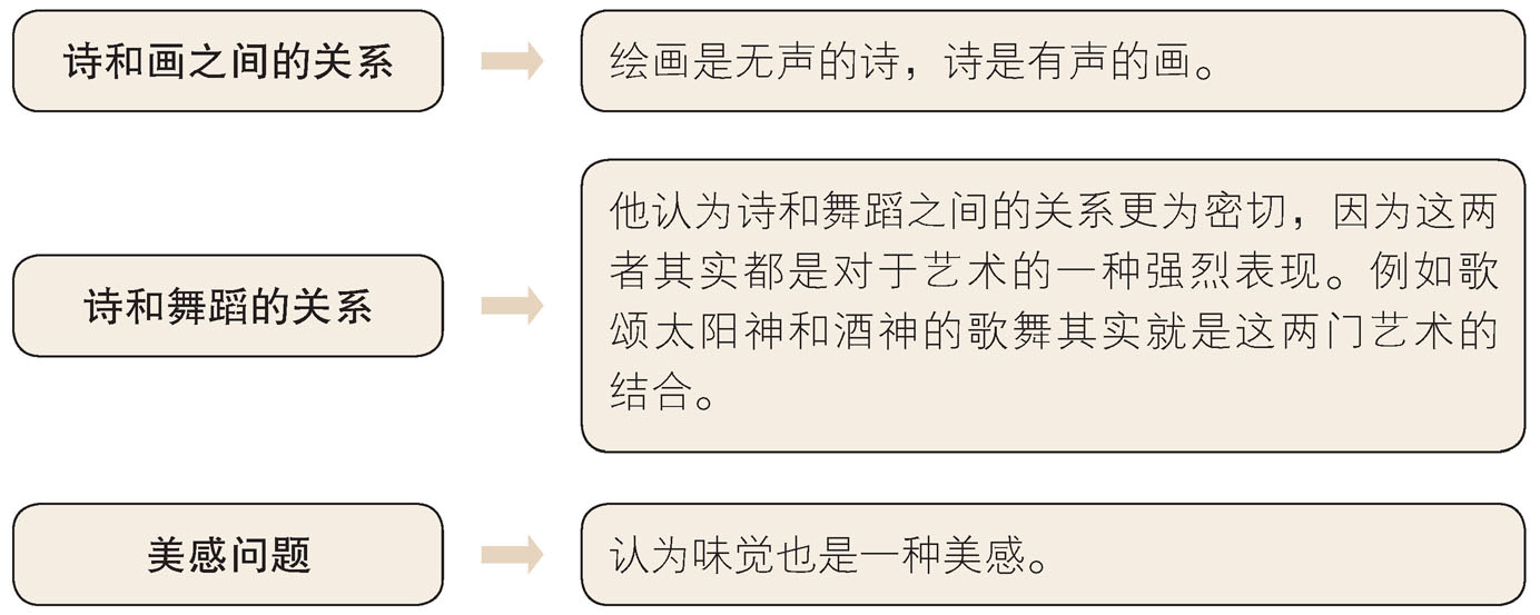 普鲁塔克对于艺术之间的关系也有过一些探索。比如说诗和画之间的关系,他曾经说过“绘画是无声的诗,诗是有声的画”,就是说诗和画之间是相通的,同样的内容,由不同的形式进行表达,造就了不同的艺术形式。但是他认为,诗和舞蹈之间的关系更加密切,古希腊人歌颂太阳神和酒神的歌舞,其实就是这两门艺术之间的结合。其实也可以将这两门艺术之间的关系用同样的话来概括:舞蹈是无声的诗,诗是有声的舞蹈。