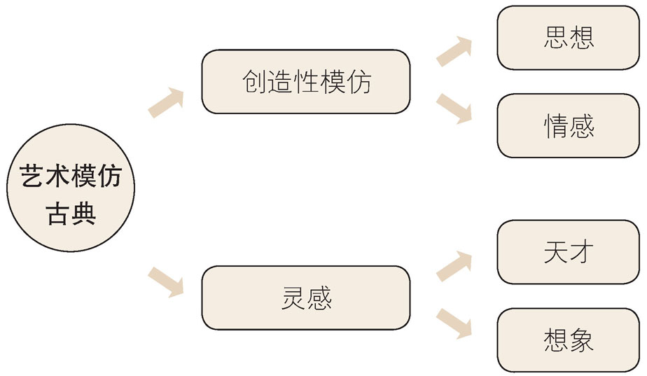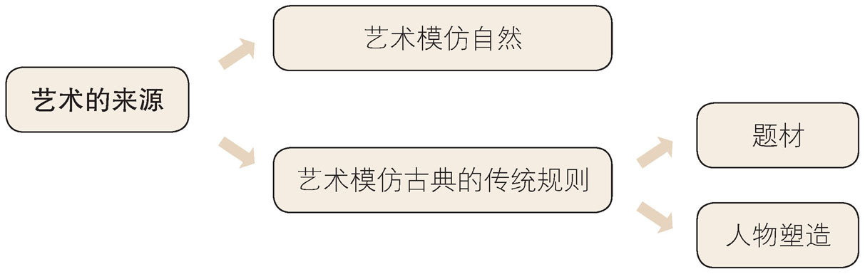 在文艺的产生方面,他首先接受了 艺术模仿自然 的观点。但是他认为艺术不仅仅是对于自然的简单模仿,而是模仿亚里士多德所说的可然性现实、模仿柏拉图所说的理念、模仿古典、 模仿古希腊文化 中的传统规则,在题材的选择和人物的塑造方面,都是如此。他虽然不反对新的题材选择,但是更倾向于古希腊的旧题材。他认为如果自己创造独特的办法是很难的,那么即便是创造普通题材也是很难的,无法达到预期的效果,这样还不如将古希腊的旧题材加以改编,反而更有意义。于是他将不同年龄的人物典型进行了划分,将这些人的共同特点进行了概括,总结出某一类人典型的人物性格,这种典型大多都是来源于古希腊的文艺作品。看起来这些思想都是在推崇古希腊的文化,但是却又过于公式化和概念化,束缚了文艺的创作思路。