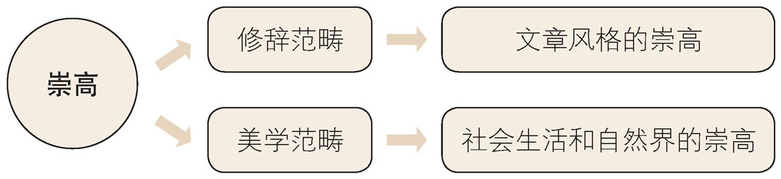 朗吉弩斯最初论述的崇高,是 文章风格的崇高 。他认为崇高存在于一种高深奇妙的措辞当中,但又不仅仅是因为语言的巧妙,还因为它们具有更加深层的力量,很多伟大的诗人和散文家都是因此而具有永久的地位。文章风格的崇高不仅仅是因为文辞或是表达方面的技巧,更是因为其中包含的强大的精神力量、高超的思想认识、强烈而庄严的情感共鸣。这种崇高能够对人的心灵和灵魂有极大的提升,产生一种慷慨激昂的喜悦,这是超乎普通的情感和体验的。他认为这种由高妙的措辞和强大的精神力量构成的崇高作品,能够控制人们的心灵,使人们被这种类型的文章和思想所征服,并且人们在感受到这样的崇高、庄严、雄伟之后,也能够将这种品质深入到自己的灵魂深处。所以说这种强烈的感情带给人的影响绝不是暂时的,而是深远持久的。同时他的想法也是相对辩证的,在把情感摆到一个十分关键的位置的同时,也没有忽略理智和理性。