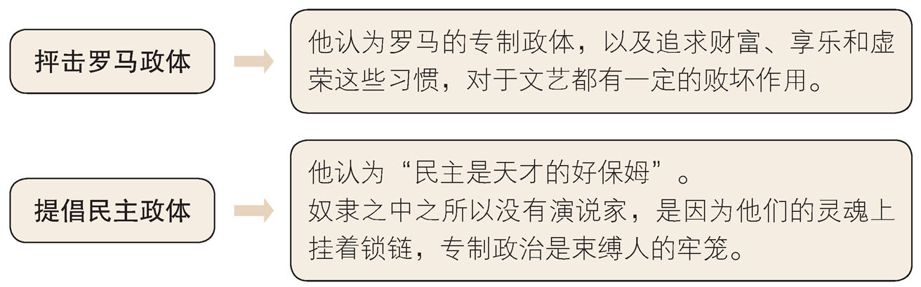 所以他也在他的作品当中提出了一些应对的解决方法。他为罗马文艺的发展提出了古典主义的方向,认为人们在创作的过程中应该向古代希腊的文艺进行学习。因为古希腊的文艺是最符合自然、理性的规则的,是最好的榜样。除此之外,对于想象,也应该有所限制。其实他并不是反对想象、独创和感性这类原则,而是认为应该加以限制。他认为应该用规则来约束想象,在传统当中追求独创,用理性来引导感性,这样才能够创作出好的文艺作品。他归纳的这些其实就是古典主义的基本精神。