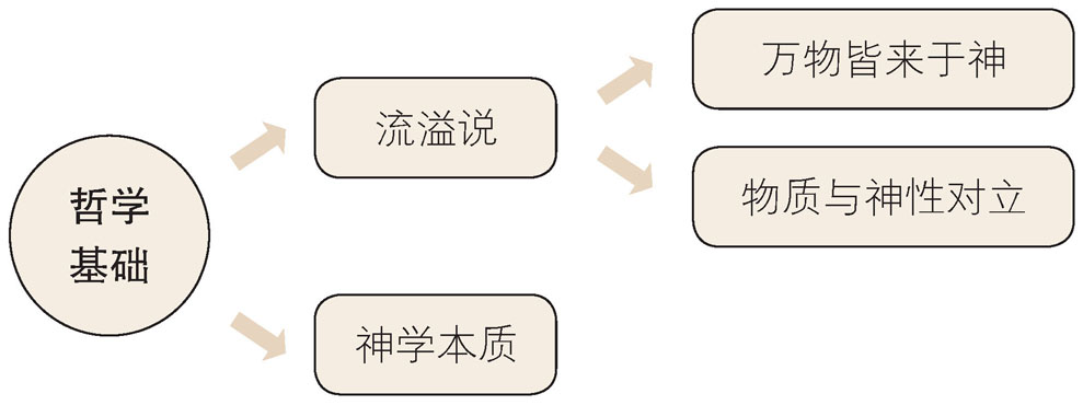 普洛丁哲学思想的核心是“流溢说”,这是一套神创世纪的理论。他认为 万物皆来自神,又要回归于神 。他认为宇宙的本原是太一,它是宇宙的第一性,也是柏拉图所说的最高理念、纯粹理性,是真善美的统一。神创造万物的方式是流溢,所有事物都是太一或神流溢出来而形成的。首先流溢出来的是理智和宇宙精神,然后是感性世界和灵魂,最终流溢出物质。流溢的过程,也是流溢对象逐渐变得低级的过程,最终流溢的物质与神是相对立的。除了物质,所有流溢的东西最终都要回归神性,要与神契合,也就是要追求绝对的永恒的真善美或绝对理性。因为物质与神性是对立的,所以是不回归神性的。