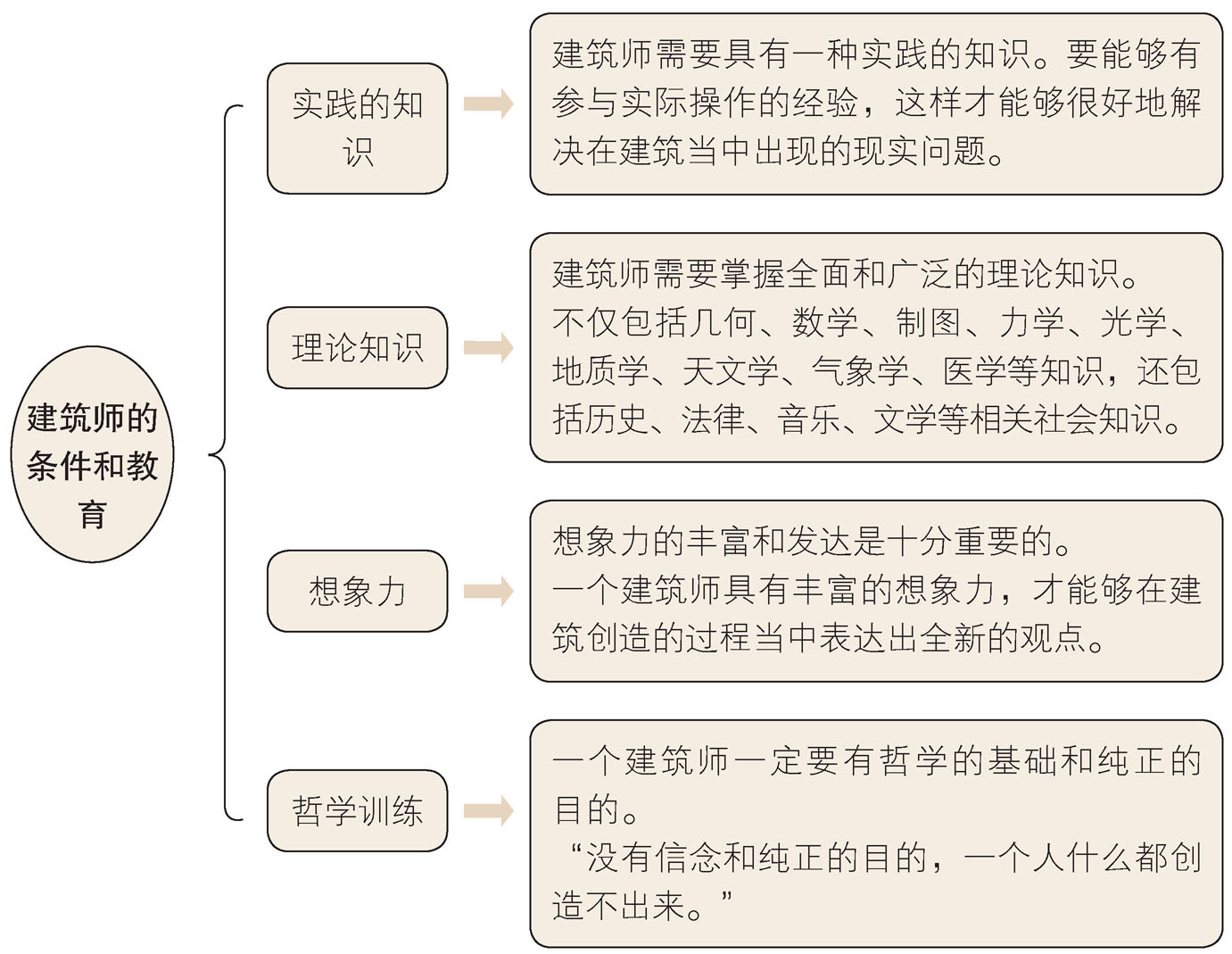 从对建筑的要求出发,维特鲁威又提出了对建筑师的教育问题。他认为建筑师要有两方面的知识,第一是 实践知识 ,指的是在建筑实践的过程中需要的能够完成任务的能力和经验;第二是 理论知识 ,这包括了对于美学的一些知识构建。其中他比较注重的是想象力,他认为一个合格的建筑师要有对建筑的虚构和想象的能力,这样才能够创造出建筑的美。除此之外,他认为哲学的观念也能够引导建筑师的工作,因为如果没有纯正的目的和理念,是肯定创造不出好的作品的。