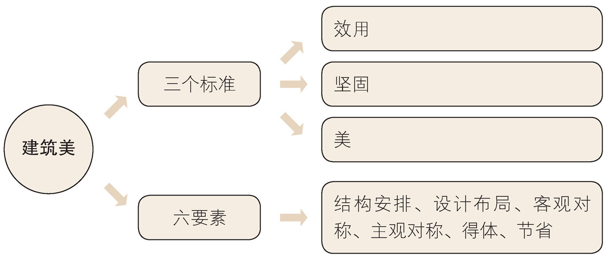维特鲁威认为,评判 建筑是否美有三个标准:效用、坚固和美 。这是在他的作品《建筑十书》中从头到尾贯穿的根本思想。也就是说,他认为建筑不仅要满足人们对它的目的性需求,要实用价值高、使用时间长、抗击能力强,同时也要满足人们的审美要求。只有同时满足了这两种不同的需求,建筑才有真正的美感。
