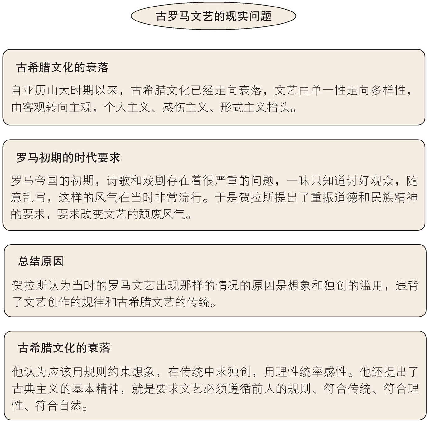 从亚历山大之后,古希腊文化出现了衰落现象,贺拉斯的《诗艺》正是要改变当时文艺的颓靡现象。他认为,罗马文艺滥用独创和想象力,违背了古希腊文艺创作的传统和基本规律,因此他指出应朝着古典主义的方向努力,向古希腊的文化学习。他曾说“须 勤学希腊典范 ,日夜不辍”,这正是古典主义的实质。