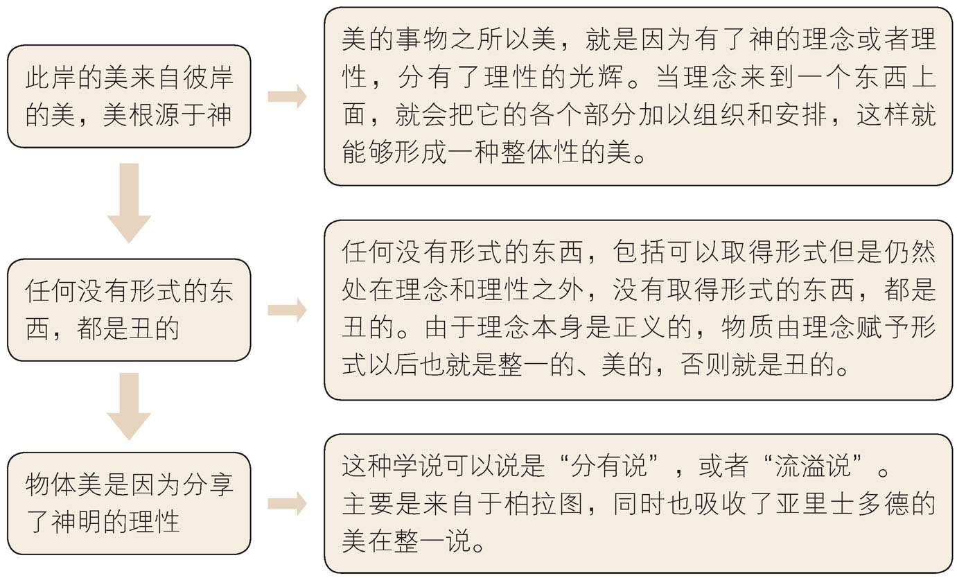 普洛丁是古罗马时期的唯心主义哲学家,是新柏拉图主义创始人,也是中世纪宗教神秘主义的始祖。因为他出生在埃及,生活于希腊,又曾经有过到东方印度和波斯游历学习的经历,所以在他的哲学思想中,融合了柏拉图的客观唯心主义思想、基督教的神学思想和东方的神秘主义思想。他的著作经由整编形成《九章集》,其中的《论美》和《论理性美》都阐述了他的美学思想。