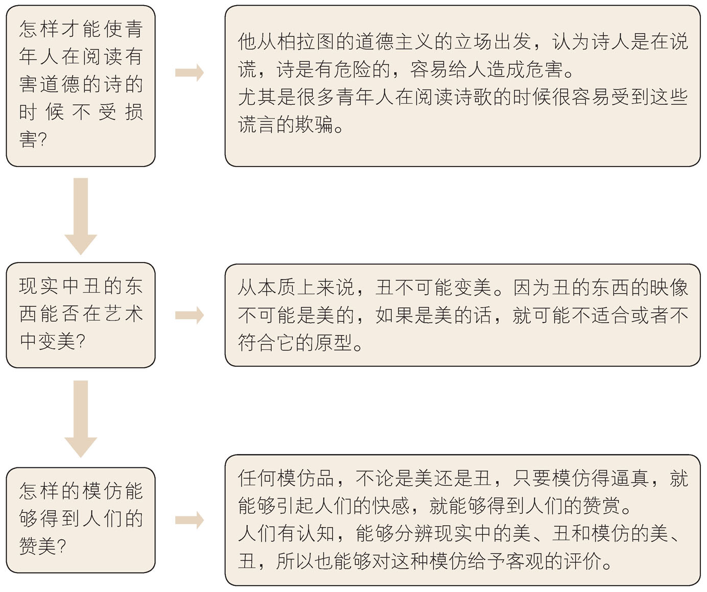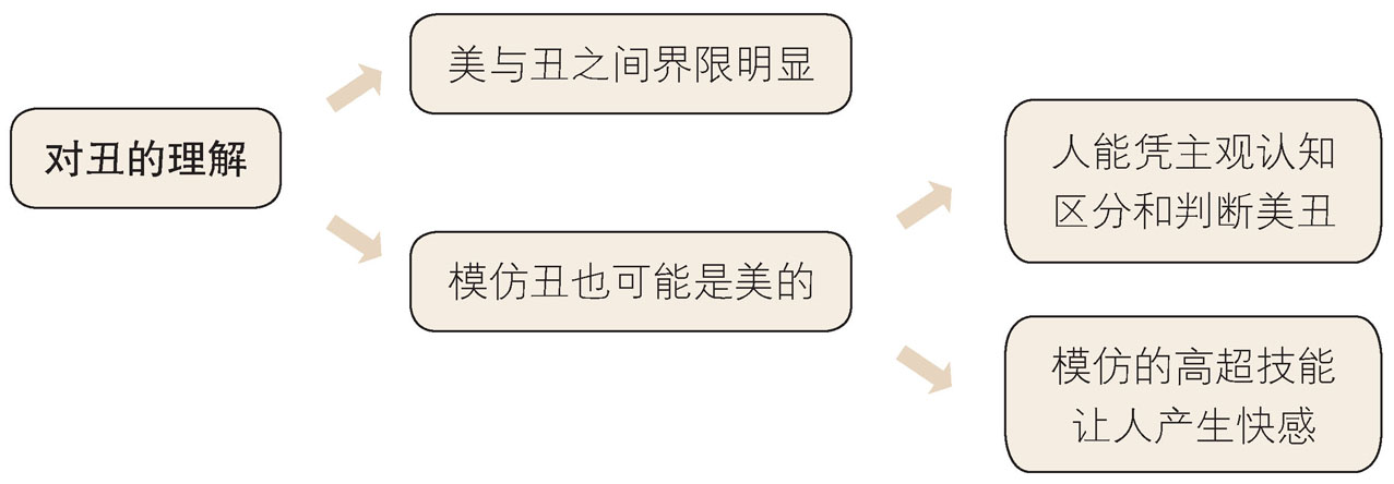 但是在进一步研究的过程中,他又发现,艺术作品中对于丑的事物的模仿,并不会让人们感到丑恶,如果模仿得非常逼真,还会引起人们的快感和美的享受。比如当口技者模仿猪叫或者绞车发出的吱吱声时,观众都会觉得兴趣盎然,而并不觉得这些声音在现实生活中原本是令人讨厌的,这又是为什么呢?于是他进一步指出,人们会对这种模仿产生快感,就是因为人通过智慧将这种对事物的模仿和事物本身进行了区分。也就是说丑的东西和模仿丑的东西实际上是完全不同的两回事,而人类能够凭借自己的认知对其进行区分,并且判断其好坏美丑。最后他指出模仿美的事物和用美的方式模仿事物其实是完全不同的,也就是说他认为人们欣赏模仿丑的东西的艺术作品而产生快感,是因为创造者高超的模仿技能,而并不是因为他在模仿丑,艺术中 模仿的丑也是能够带给人美的享受的 。