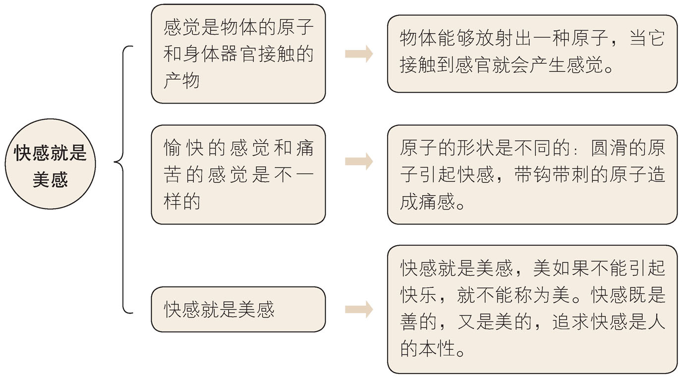 他们认为,每种物体都是能够放射出原子的,当人与这些物体释放出的原子进行接触的时候,人就会产生感觉,这种感觉正是由于物体的原子和身体器官发生接触才产生的。但是每种物体释放出的原子的形状也是不同的,有的物体释放出来的是圆滑的原子,这种原子就能够令人在与之接触的过程当中产生快感;有的物体会释放出带钩带刺的原子,这种原子就会令人产生痛感。而人在产生快感的时候,就会产生快乐,能够令人产生快乐的事物就是美的事物,所以这样的事物就是真正的美。因而,快感就是美感。