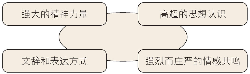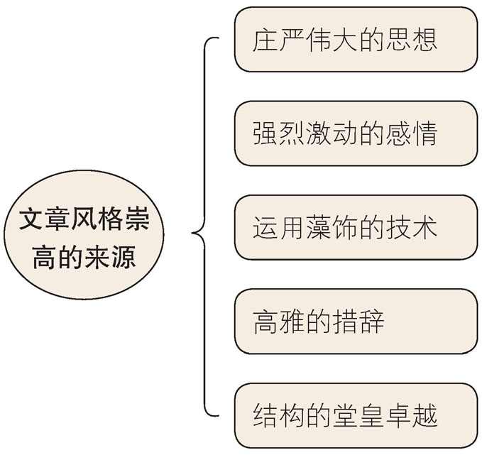 他认为文章风格的崇高有 五个来源:庄严伟大的思想、强烈而激动的感情、运用藻饰的技术、高雅的措辞、整个结构的堂皇卓越 ,其中最后一个是对前四个来源的总结。因为“崇高可以说是灵魂伟大的反应”,所以说创作者一定首先是个崇高的人,才能够创作出崇高的作品。