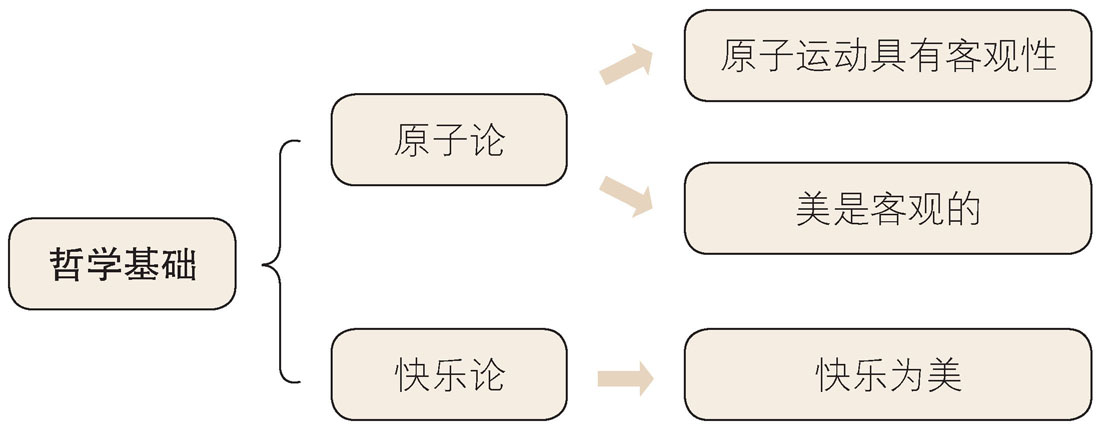 伊壁鸠鲁派的美学思想的根源是 唯物主义的原子论 。他们继承了德谟克利特的原子论的学说,认为世界的本质是原子和虚空构成的运动。原子除了有形状、次序和位置之外,还有重量这一性质。而原子的数量是无限的,原子形状的种类是有限的,它在无限的虚空中进行永恒的运动。 原子的运动既有必然性 ——有序的垂直下落; 也有偶然性 ——某些原子下落过程中产生的碰撞而导致的偏斜运动。正是因为如此,自然才从本质上具有永恒无限的创造力。他们用运动的变化的观点理解世界和美的创造过程,所以他们认为 美是客观的 ,并随着自然的变化而变化。他们的美学观点具有反神学的唯物主义特征。