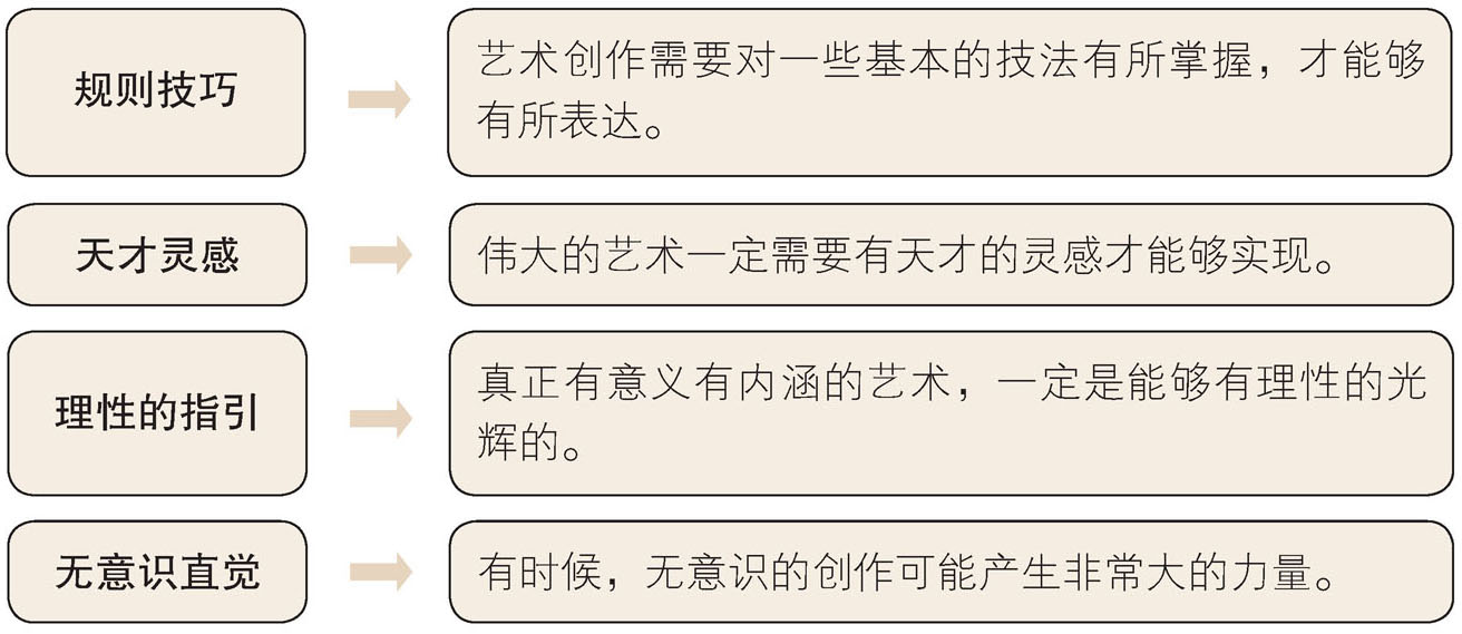 西塞罗还研究了艺术创造的条件。他认为,艺术在创造的过程当中都是需要有一定的条件的。比如说艺术创作的过程中一定要掌握一些基础的技法,这就相当于一个人在做工的时候需要有得心应手的工具。艺术创造的过程还需要有天才的灵感,这样的灵感能够引导人们走向一个全新的认识世界。艺术创造还需要理性的引导,这样创造出来的艺术作品才能够以理性的视角给人以指引。艺术创作还需要无意识直觉,这种强大的力量虽然难以说清,但是能够在很大程度上推动人的艺术创造力。