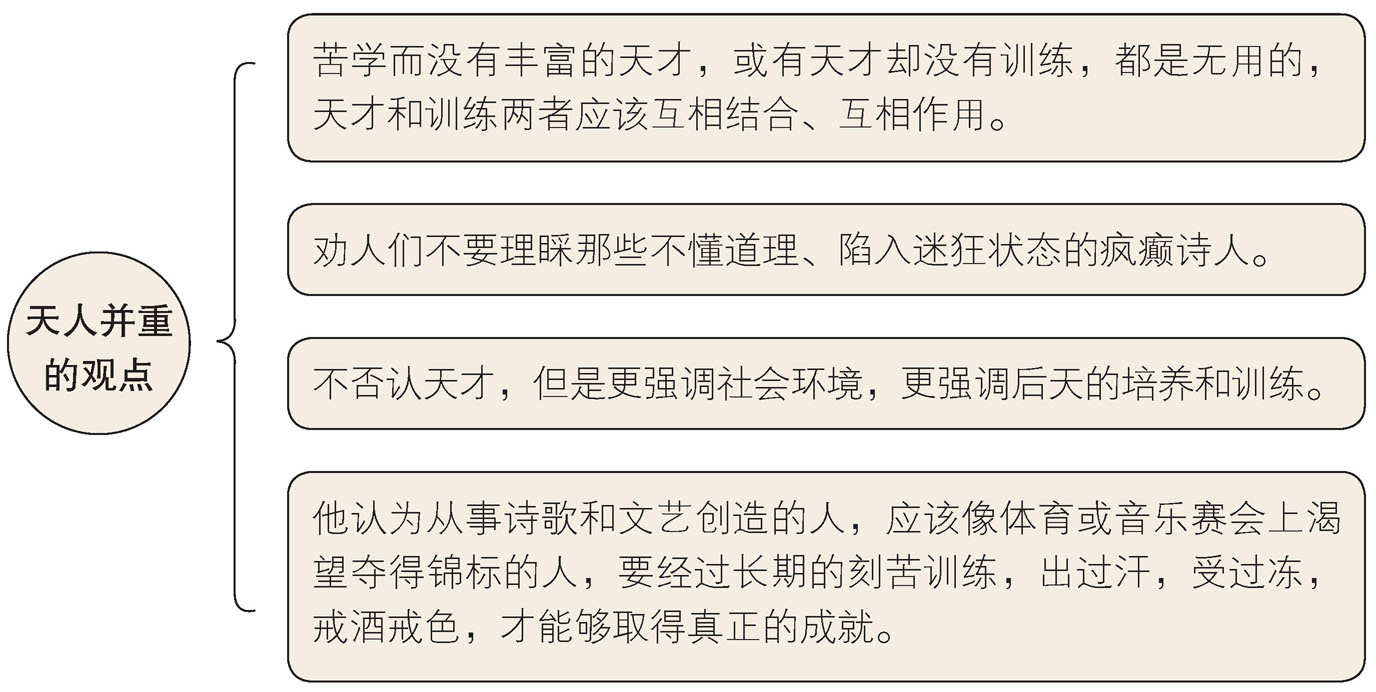 在天才和艺术的关系问题上,贺拉斯认为应该是天人并重的。别人曾经问他,写一首好诗,重要的是天才还是艺术?他说,这两者都是非常重要的,两者应该互相作用、互相结合。如果说只有苦学但是没有天才,这样的人可能只是勤奋,但是却没有华丽的想法;但是如果只有天才却没有勤奋,这样即使有想法也不可能表达出来。所以这样看来二者都是非常重要的。但是他还是更加强调后天的培养和训练,他认为人要经过长期的刻苦和训练,才能够真正取得成就。