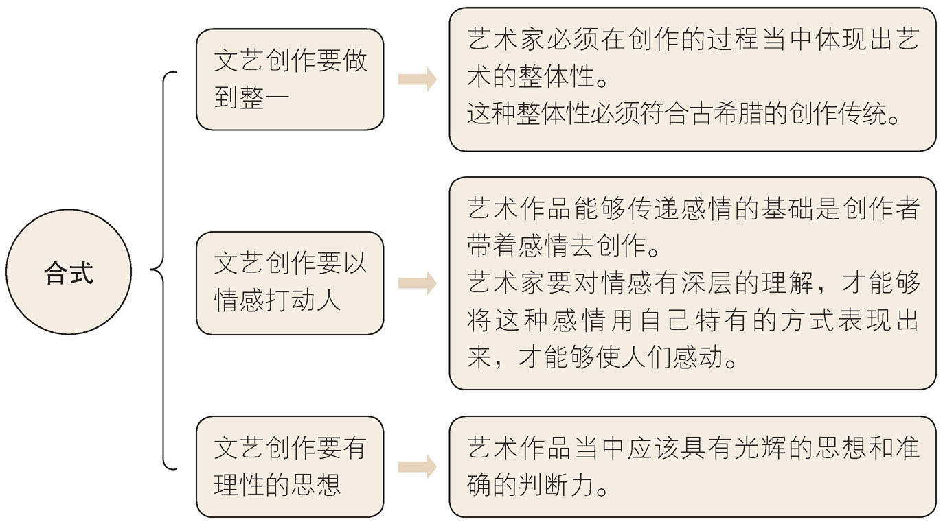 贺拉斯的另一个基本概念 “合式” 最能够体现古典主义的精神。他认为合式是文艺的最高标准,在这个标准中不仅包括内容形式的整体合一,同时也涉及情感、思想,所以说这个概念既具有审美意义,又具有道德意义,这正是古典主义精神的体现。