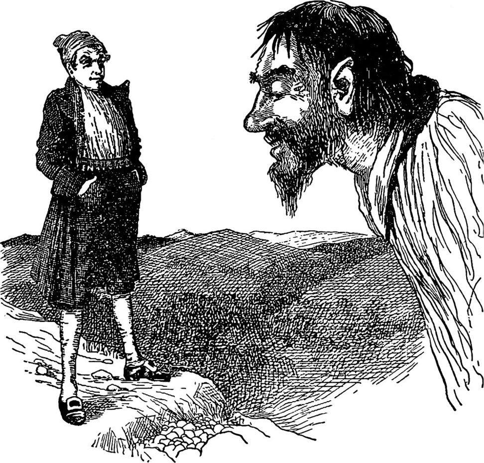 两个巨人又重新躺下睡着了。这一次,小裁缝又拿石头朝另一个巨人的头上砸下去。