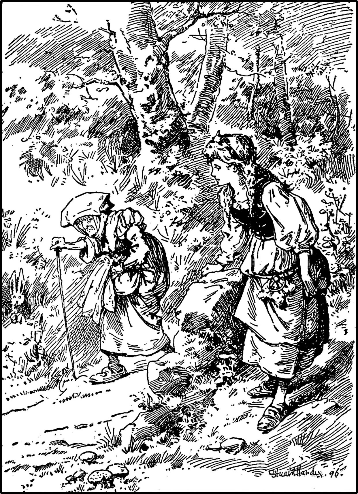 一年后,弟弟出门去找哥哥了,他也一去不复返。第三年,他们的小妹妹为了找哥哥也来到河边,她遇到了那位老婆婆并问候道:“老婆婆好!”