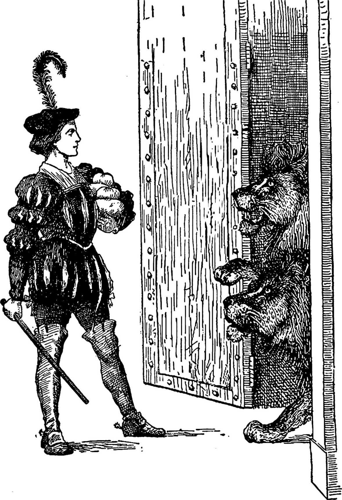 三王子对小矮人表达了谢意,带着魔杖和面包上路了。他一路艰难跋涉,终于来到了小矮人说的那座城堡门前。他按照小矮人的说法很快通过了大门和狮子这两关,进入一间华丽的大殿中。
