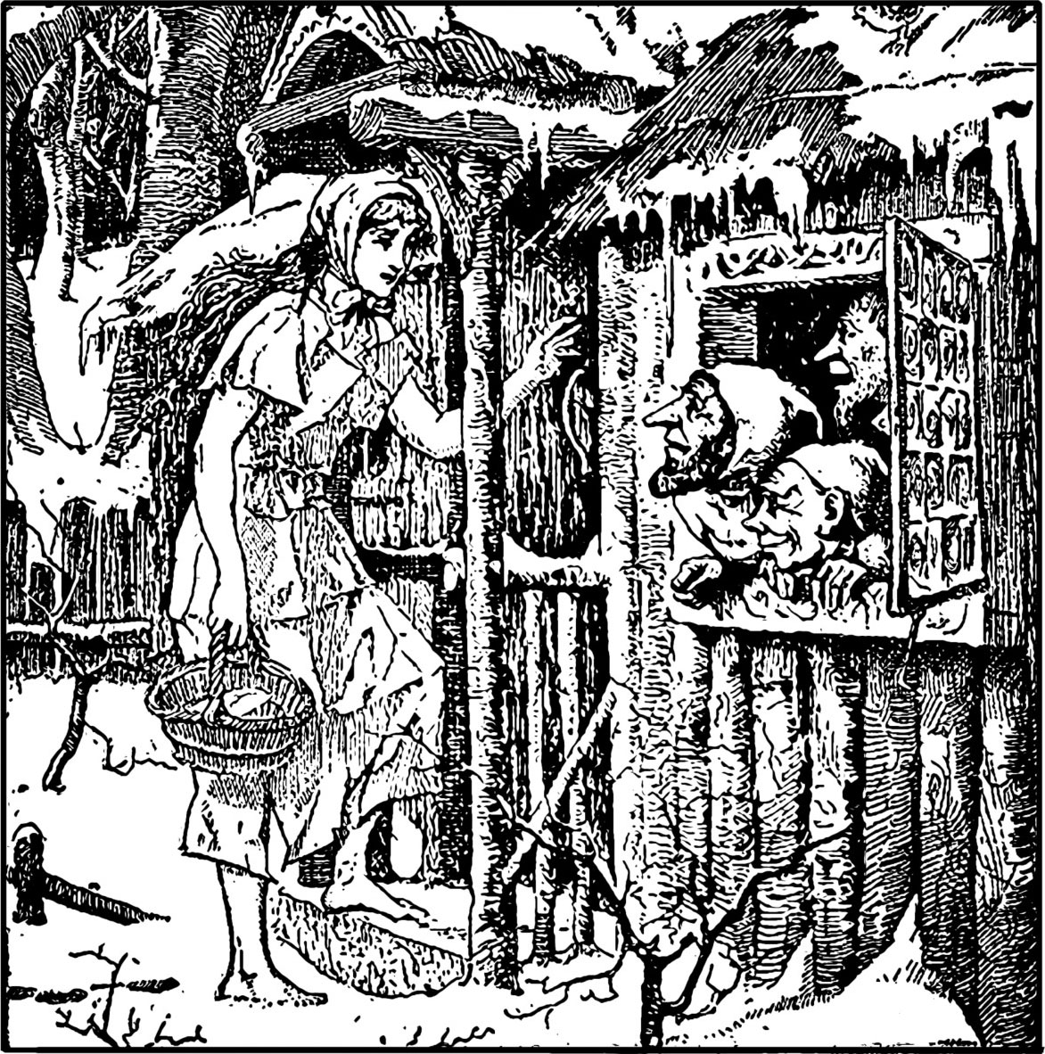 “看她那副讨厌的样子!”继母的女儿尖叫道。她嫉妒小姑娘能碰到这么好的事情,于是也嚷着要去外面采草莓。