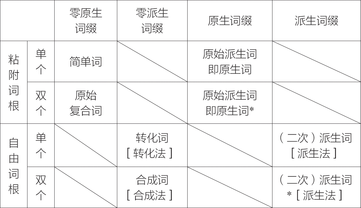 表格中所体现的是构词的结果,其中有星号(*)的派生词较为少见,中括号([])中标出的是传统构词法的相应区域。