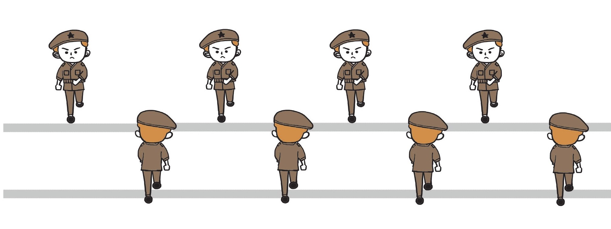 可能聪明的小朋友会问了,虽然原子核之间隔了很远,但如果让每个原子核或电子都运动起来,就像让每个士兵都在自己的队伍里来回跑动,这两队士兵是不是就会相撞了呢?答案是相撞的可能性的确会增大,但依然非常小。因为相邻士兵之间毕竟隔了100公里,那可是从北京到天津的距离。不相撞,就可以互相穿越。那为什么我们在现实生活中从未看见水杯穿越桌子掉下来呢?