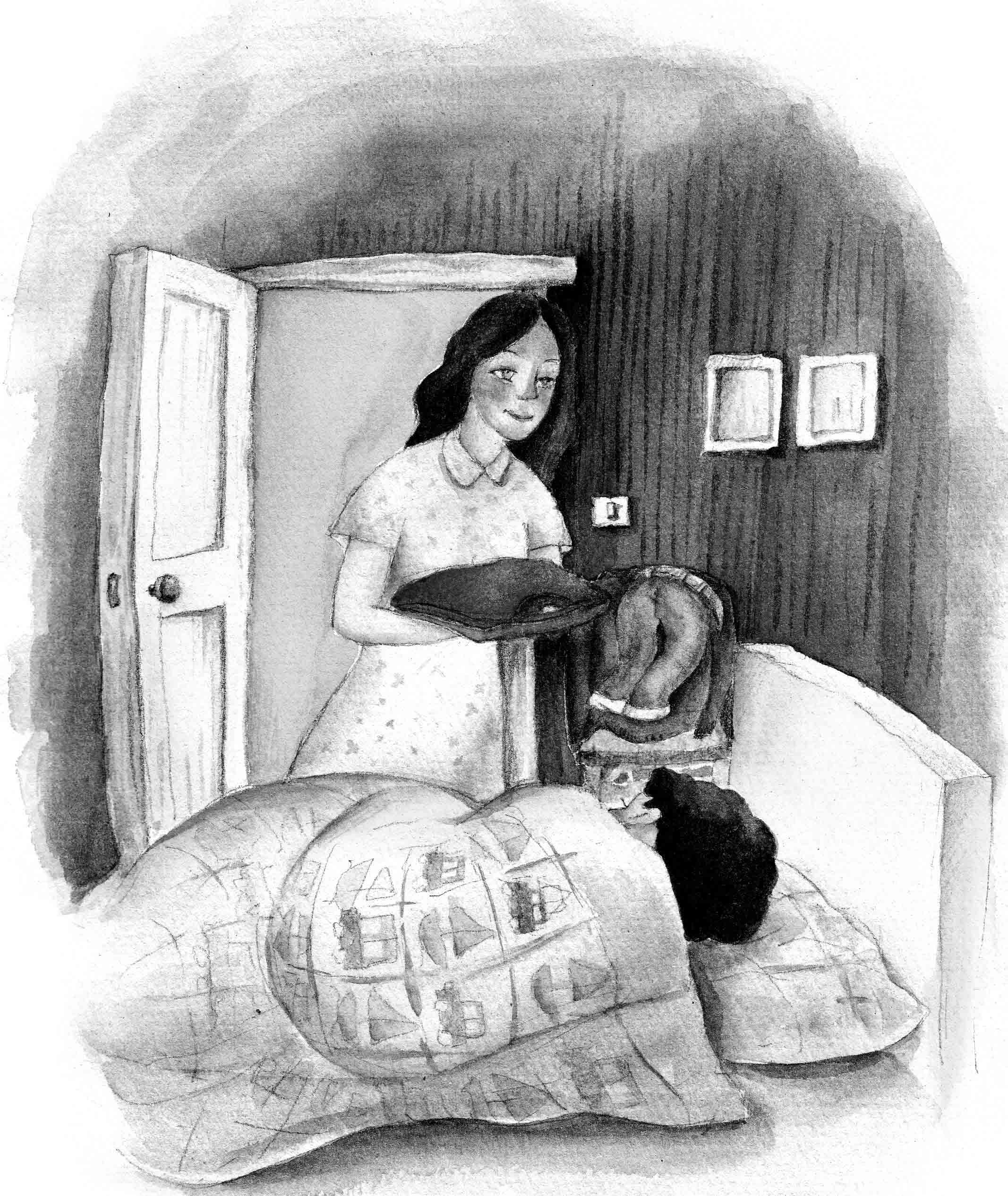 这时她到了外面的过道里。他听到她在开衣橱门的声音。他知道她在找什么。这期间还伴随着一种轻轻的嘎吱嘎吱的声音,这大概是父亲在扫地。接着,母亲把橱门关上了。