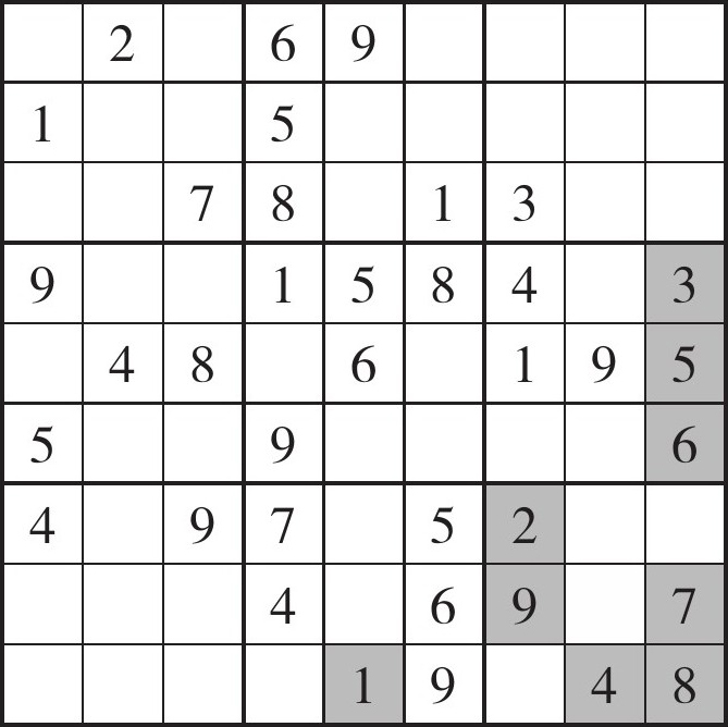 I9的相关格组分别在行I、列9和宫9,于是就看这三个单元,我们发现一共出现了1、9、4、3、5、6、7、2这些数字。根据摒除法的规则,I9的位置将不得填入它们。神奇的是,在9个数字中,只有8没出现。根据“1~9的每个数字都要出现一次”的法则,得到结论,I9=8。