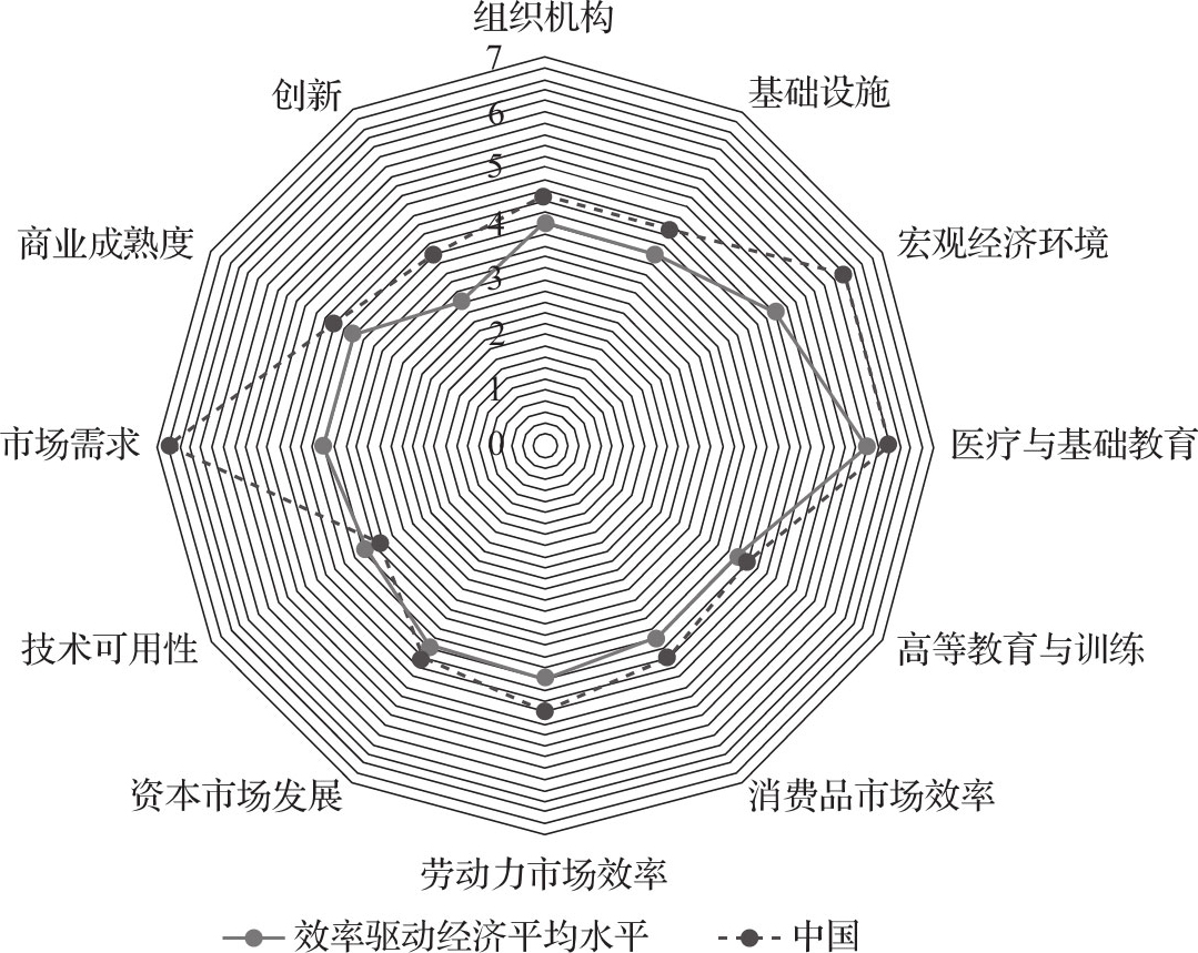 从图2-4可以看出,中国各方面指标基本都高于效率驱动经济平均水平,正处于效率驱动向创新驱动转变的阶段。当前中国最大的优势是旺盛的市场需求,再加上稳定的宏观经济环境,这是决定中国未来崛起的两大优势;但是中国的短板也非常明显,在技术可用性方面还非常不足。