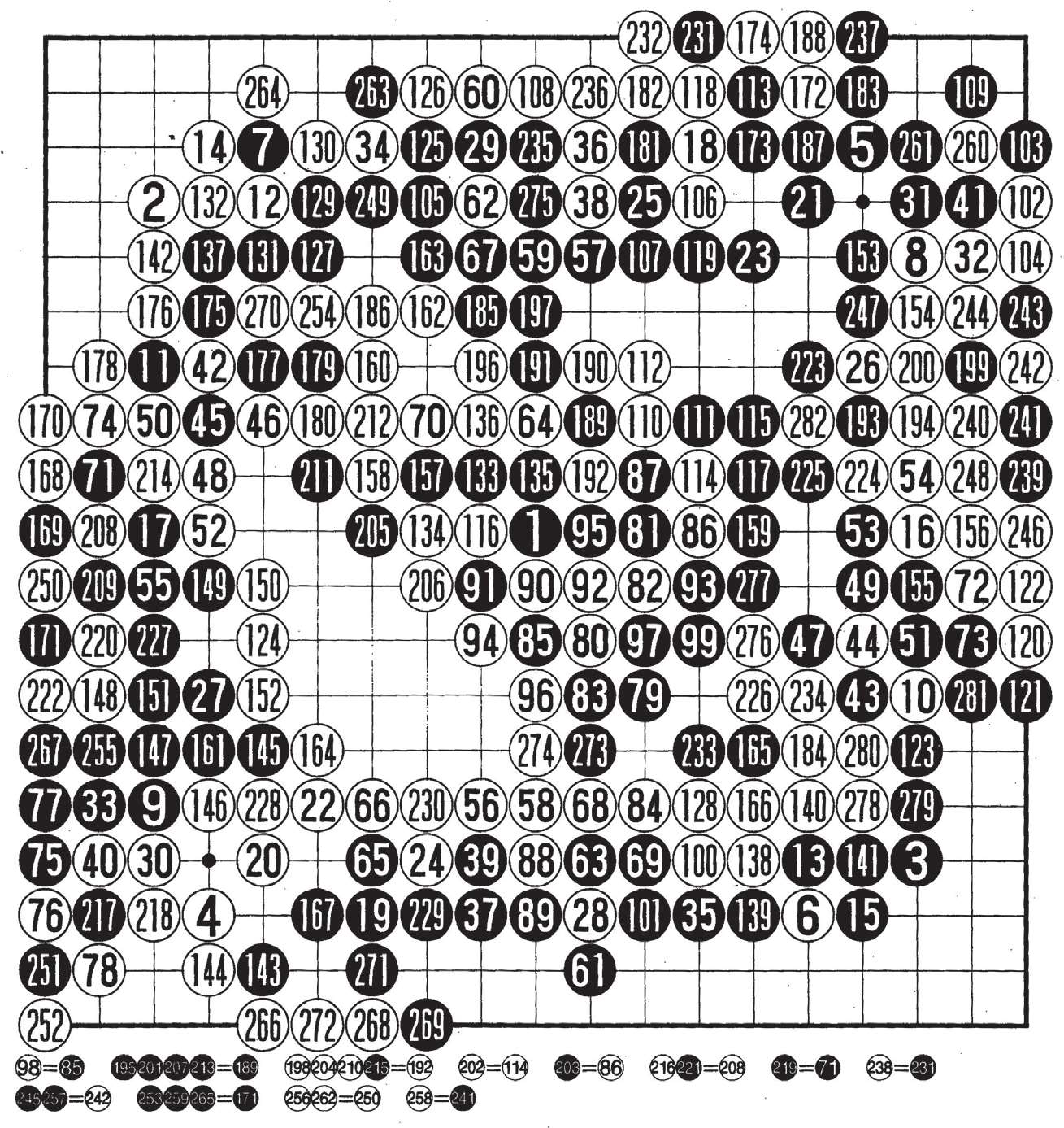 如此一来木谷实只好安心下棋。为了摆脱被模仿的命运,木谷实铤而走险,率先在棋盘中央挑衅。同时面对吴清源的反击却不鲁莽,总是小心地应对。所以尽管吴清源的模拟战术收效甚大,但还是在第124手的时候,因实力略逊被木谷实反超三目取得了胜利。