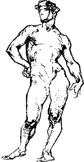 显然,用这些简单的线条便可以画出人体大致的轮廓,这体现了人体大致的比例,不仅如此,还体现出了人体和谐统一的美感。另外,需要重点指出的是,头部、胸部和骨盆是人体的三大块,这些体块自身是固定的。你可以把这三个体块想象成三个各有四个侧面的立方体。它们是对称放置的,平衡地处在一条自上而下的直线上。体块之间相对静止,但当这些体块向前或向后运动,便使人的整体有了动态。所以,不论这三个体块如何扭曲和变化,不论一侧的变化如何密集和集中,总有另一侧的身体比较柔和。总有一种协调感贯穿人体,这被称作人体的节奏,这种节奏比较微妙,不易发现,不好捕捉,需要用大量的时间来学习它。