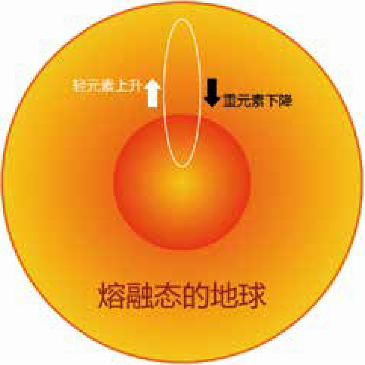这颗灰秃秃的小星球原本没有任何结构,就像你从地上随便抓起一把泥土捏成一个球球,在其内部没有哪个部分比其他部分更为特殊。但是,时间可以改变一切。在这个小球球的深处,随着整个球球在自身引力作用下不断收缩,中心处的压力越来越大,密度越来越高,处于中心的物质分子所辐射出的热开始受到阻挡而无法再释放到周围宇宙中,从而导致中心区域升温。当地球中心的温度达到铁的熔点时,附近的铁、镍,以及硫化铁开始熔化,因密度大而流向中心,成为液态的地核。伴随地球的进一步收缩,压力进一步加大,中心区域的温度越来越高。由于中心区域的铁已经是液态,这种铁液在热量下形成的对流迅速把中心区域的热量向外层物质传送,将更多的物质熔化。这种作用最终从深远的地心一直传递到地表。有那么一个时期,整个地球都处于一种熔融态。这种充分的熔融使得重元素向中心沉降,而轻元素则向地表上浮,无结构的地球在熔融态的对流中自动形成了清晰的层次结构。