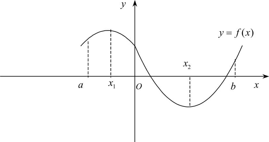 设函数 y = f ( x )在闭区间[ a , b ]上连续,如图 2-17 所示,我们可以看到曲线 f ( x )在[ a , b ]上至少存在一点 x 1 ( a ≤ x 1 ≤ b ),使得函数值 f ( x 1 )最大,即 f ( x 1 )> f ( x ), x ∈[ a , b ];同样还至少存在一点 x 2 ( a ≤ x 2 ≤ b ),使得函数值 f ( x 2 )最小,即 f ( x 2 )< f ( x ), x ∈[ a , b ]。