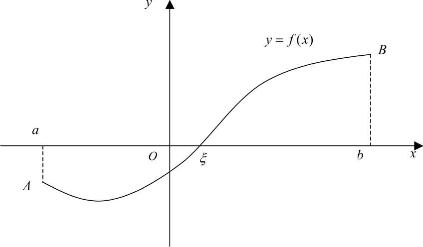 从几何上看,如图2-19所示,曲线 y = f ( x )的图像从 x 轴下侧的 A 点连续画到 x 轴上侧的 B 点时,至少要与 x 轴相交一次。这表明若方程 f ( x )=0,其左端的函数 f ( x )在闭区间[ a , b ]端点处的两个函数值异号,则该方程在开区间( a , b )内至少存在一个根。