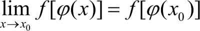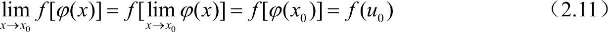 定理2.6 设函数 u = φ ( x )在点 x 0 处连续, y = f ( u )在点 u 0 处连续,且 u 0 = φ ( x 0 ),则复合函数 y = f [ φ ( x )]在点 x 0 处连续。即