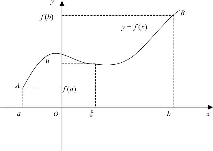 从几何上看,如图2-18所示,闭区间[ a , b ]上连续函数 y = f ( x )的图像从 A 连续画到 B 时,至少要与直线 y = u 相交一次。