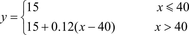 某市移动通信公司有一款优惠套餐,规定收费标准为:当月所打电话时长不超过40分钟时,只收取月租费15元,超过40分钟,每分钟加收0.12元。电话费 y (元)和用户当月所打电话的时长 x (分钟)的关系可用下面的形式给出: