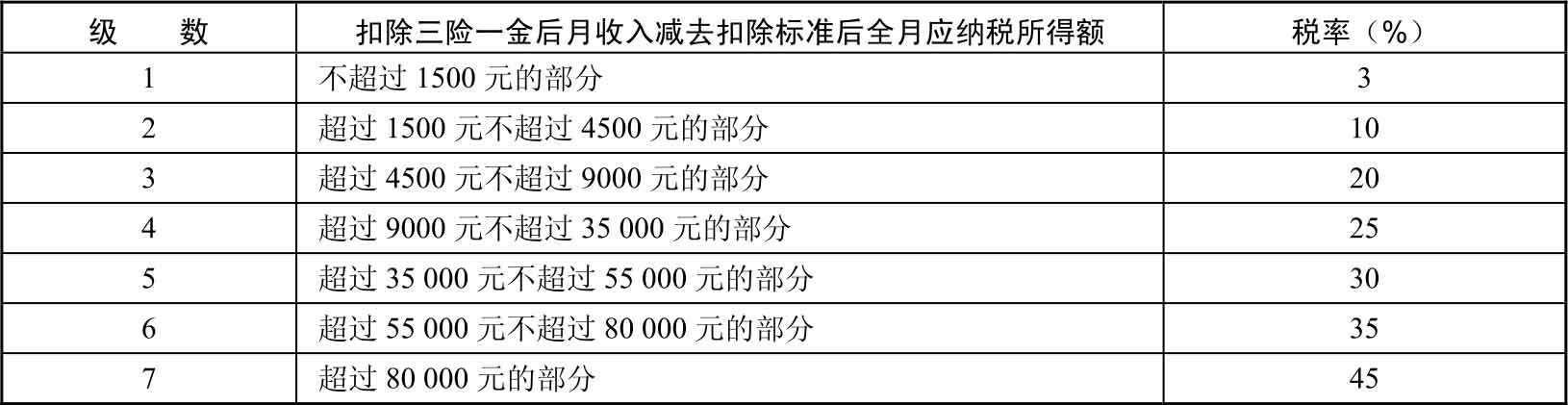 目前,在表1-2中全月应纳税所得额是从工资、薪金收入中减去3500元后的余额。例如,某人扣除三险一金后月工资、薪金收入6000元,减去3500元,应纳税所得额为2500元,由税率表可知,其中1500元税率为3%,另1000元税率为10%,所以此人应纳个人所得税为1500×3%+1000×10%=145元。