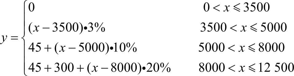 请写出月工资、薪金的个人所得税 y 关于工资、薪金收入 x (0< x ≤10 000) 的函数表达式。