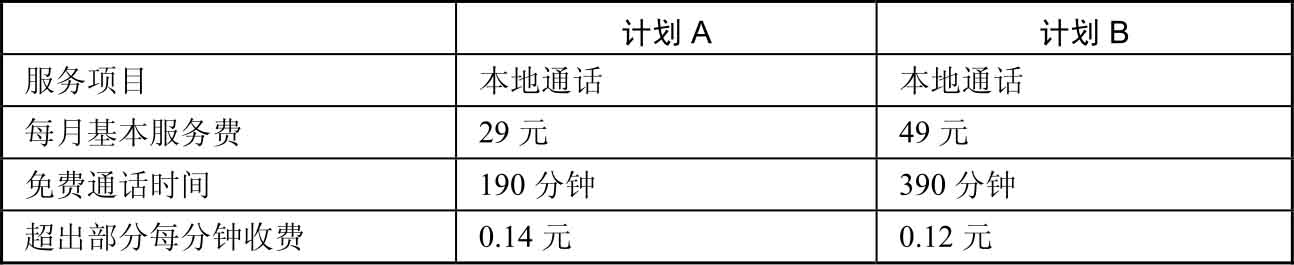 例1.7 为配合客户不同需要,某移动通信公司推出A、B两种优惠计划供客户选择,如表1-3所示。根据提供信息,解答下列问题。