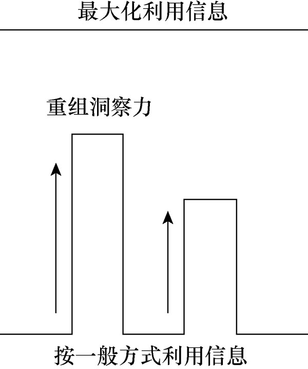 大脑是一个累积记忆的系统,它在对概念、观点等信息进行排列组合时,通常无法最大限度地利用现有信息。图1-4说明,大脑利用信息的惯常水平明显低于理论最佳水平,只有通过重构洞察力才能接近最佳水平。
