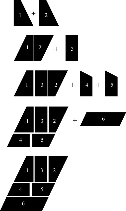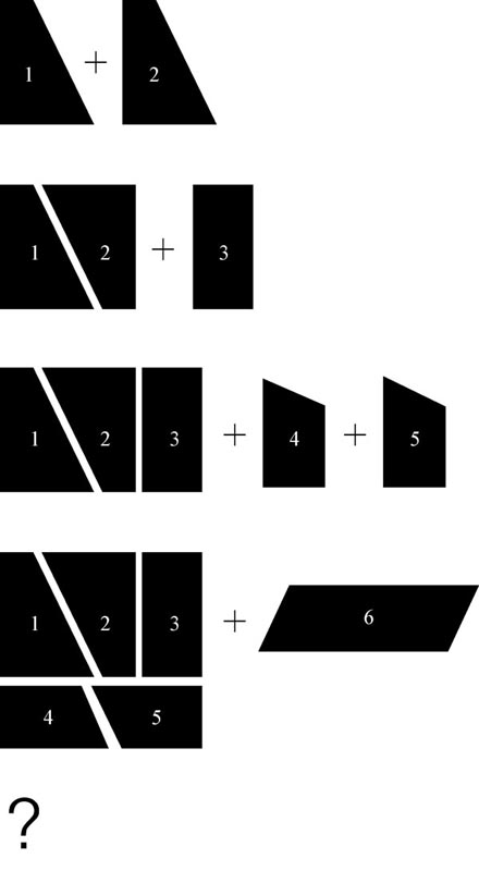 图1-2中展示了两块塑料薄板的轮廓,要求测试者将其摆放好,组成易于描述的图形。测试者通常会按照图中所示的方法排列图形。接下来再添加一块塑料板,要求不变。测试者会直接将其放在正方形的一侧,组成一个长方形。现在又加上两块板。先将两块板拼合起来,再和之前的长方形组合,形成一个正方形。最后再加一块板。测试者会发现,这块新板放哪儿都不合适。虽然之前的每个步骤都操作正确,但操作却无法继续下去。因为按照现在的形状,根本没有合适的地方放这块新板。