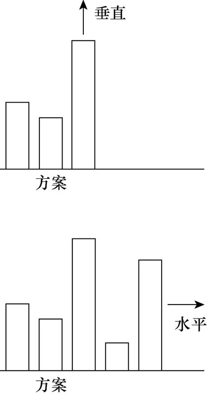 垂直思考关注的是正确性,而水平思考关注的是丰富性。垂直思考通过排除其他道路的方式选定一条道路;而水平思考的目的不是选择,而是为了开辟其他道路。垂直思考要选出最有希望解决问题的方案或看待问题的最佳方式;水平思考则要最大限度地创造出备选方案。垂直思考是在不同方式中找出一个有希望的方案便停止;而水平思考时,即便已经找出一个有希望的方案,也还要继续生成新方案。垂直思考力求选出最佳方案;而水平思考则以生成不同方案为终极目标,如图2-1所示。