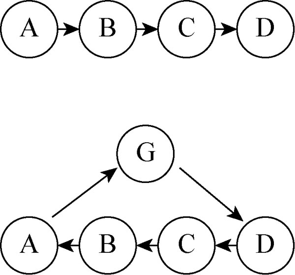 水平思考不必按顺序走,可以直接跳到新起点,之后再填补间隙。如图2-2所示,垂直思考按照固定路线,从A推进到B、C,再到D。但水平思考则可以通过G直接到达D,然后再反推回A。