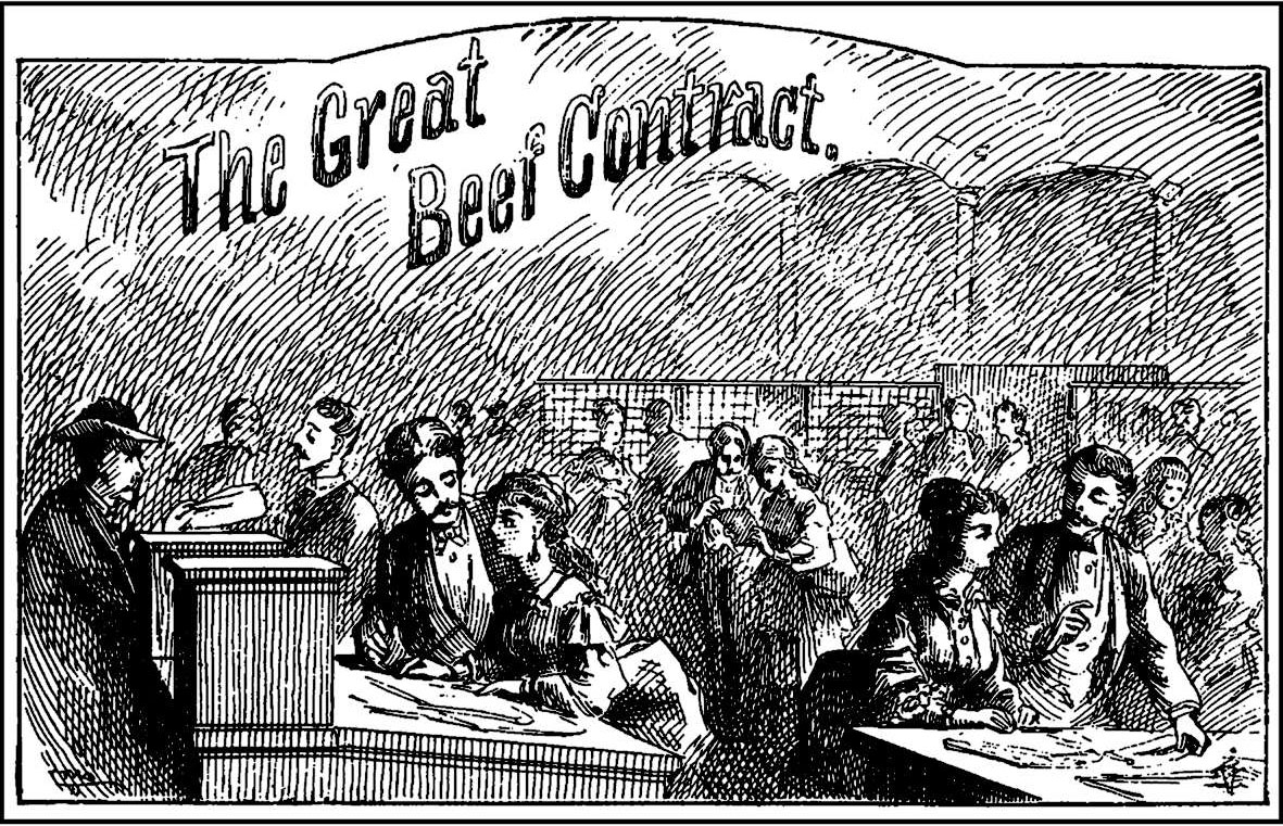 “天杀的!你终于把你那份火烧不光的牛肉合同带到 这儿 来了吗?我们 根本 不管给陆军订立的牛肉合同,亲爱的先生。”