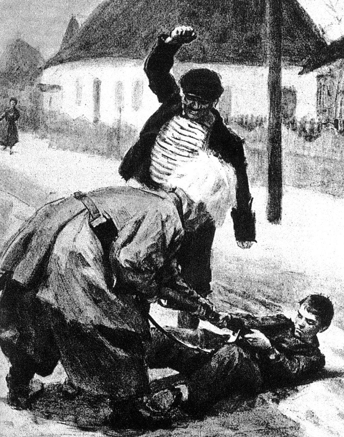 一场空前残酷的血战开始了。白军的骑兵不顾一切,像野兽一般向爬上岸的人们冲过来。扎尔基的机枪不住向周围喷射着死亡。人马成堆地倒在弹雨下面。扎尔基用狂热的速度,一次又一次地装着机枪的子弹盘。