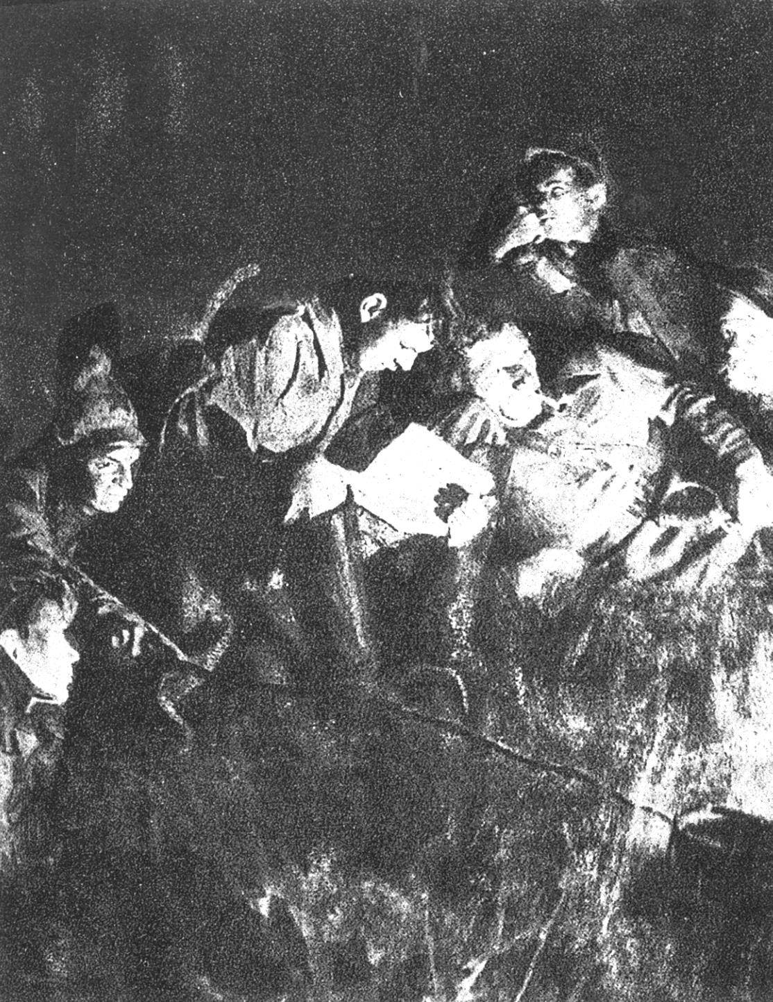 他的母亲玛丽亚•雅科夫列夫娜听见敲门声,转过身说:“请进!”一个满身披着雪的人在门口出现了。她认出了来人正是她亲爱的儿子。她双手抓着胸口,喜欢得连话都说不出来。