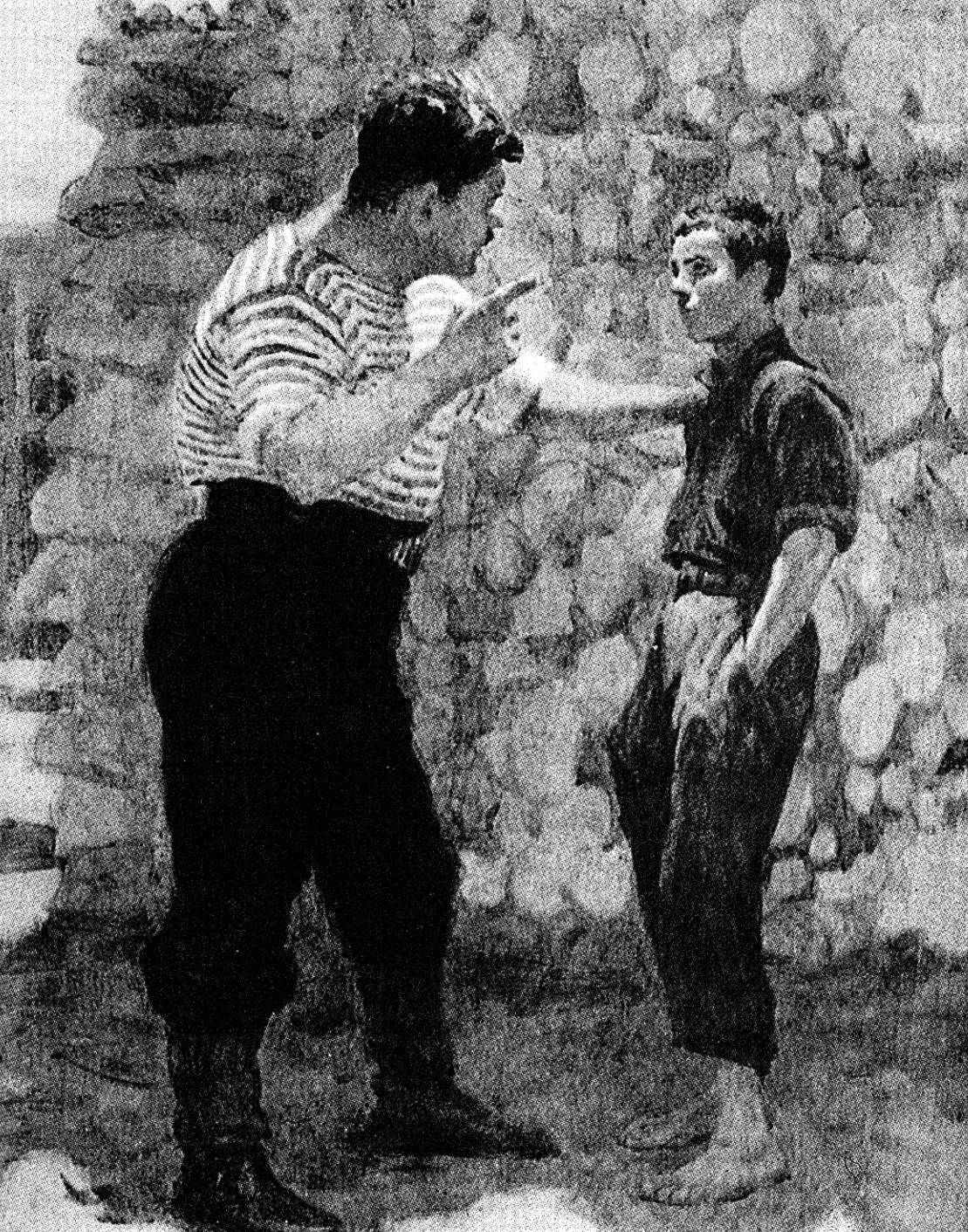 神父仔细地检查他们口袋里面的每一条缝,想找出一点烟末儿,但是什么也没找到,他就转过去对着第四个,那个黑眼睛的孩子,他穿着破旧的灰衬衫和膝盖上打着补丁的蓝裤子。